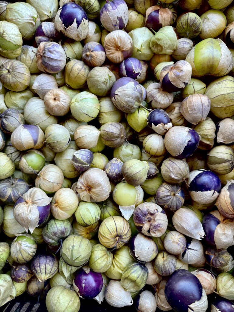 We will be bringing a number of heirloom crops to Sunday’s West Berkeley pop-up, including Tromba d’Albenga squash, Chilacayotes, Otto File corn, Galeaux d’Eysines pumpkins, Tennerumi di Cucuzzi, Tusta peppers, and tomatillo de Milpa. None of these crops are produced by the big growers here in California or sold in any regular supermarket but they all make sense in the context of a little farm like ours serving a public like you. I learned about each crop and how to grow it from a different person, so besides taking delight in their varied colors, shapes and flavors, every harvest reminds me of a friend I’ve made. Here’s my “origin story” for one of these crops, the Tomatillo de Milpa: