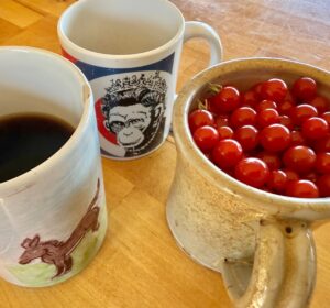 Amana Orange Heirloom tomatoes are starting up this weekend. Other colors, shapes, flavors, and sizes are ripening too.