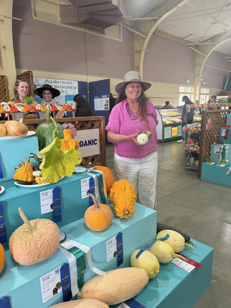 Starr at the Santa Cruz County Fair. She took first for the White pumpkin, as well as for a pie pumpkin called “Winter Luxury,” and also a selection of gourds. It was a big day for Mariquita Farm.