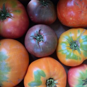 “Piennolo” means “hanging,” and the Piennolo tomato is famous for being a tomato that the peasant can pull up by the roots towards the end of the season and hang from the ceiling in the kitchen, green fruit and all. When rain and frost come in the late fall and the tomato plants in the field turn brown, fall over, and rot, back in the kitchen the Piennolo tomatoes are “hanging out.” The green fruits of the Piennolo slowly color up and all the cook has to do is reach up and pluck them. Tales abound of how the thrifty Italian peasant can enjoy flavorful tomatoes in their cosy kitchens even as the snows swirl in the wind outside. I’ve never been to Italy so I can’t report back on any contemorary authenticity to these stories but, as a farmer, I can say that the piennolo’s fruits hang on the plant in the field well and they last for a long time in the basket even after we’ve harvested them. I enjoy them in salads and in sauces. Starr dehydrates Piennolos and then packs them in olive oil. Wow! is word for that olive oil that’s left when the tomatoes are gone from the jar, and the tomatoes are great too.