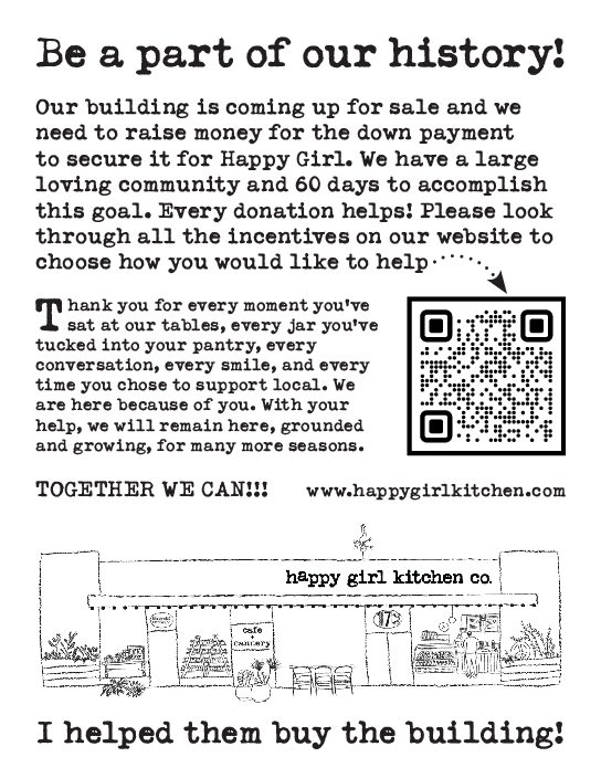 And as a hopeful person I need places like Happy Girl Kitchen to thrive; their success validates my own dreams about the healing effects of warm, positive, flavorful community spirit. Join me, and let’s all say, “We helped them buy the building!”