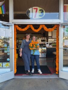 Jordan, the Happy Girl, on the left, with a happy customer on the right. Our marigolds frame the doorway.