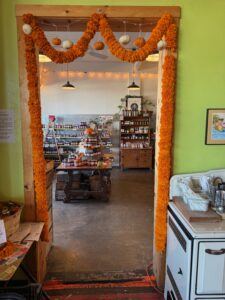 Looking from the main shop and dining area through the garland doorway to the grocery section. Happy Girl likes to deck the hall with garlands of marigold in honor of Dia de Los Muertos and Diwali